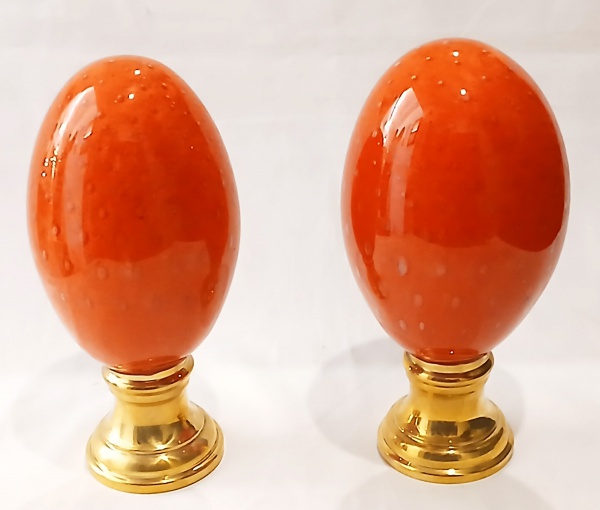 • Par de pinhas em vidro de Murano com fundo leitoso e frisos azul e base em metal dourado. Medidas: Alt. 14.5 x 11 cm