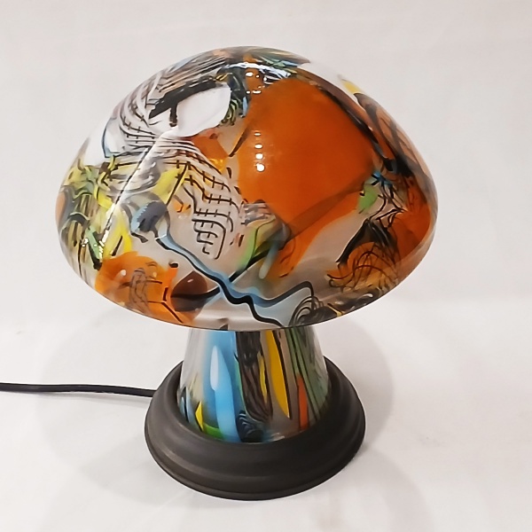 • RAVAGNANI - (Brasileiro 1962 - Ativo) - Belíssimo abajur em pasta vidro, em forma cogumelo, apresenta dupla assinatura, "RAVAGNANI" parte inferior do tronco. Medidas:  Alt. 22 x 19 cm.