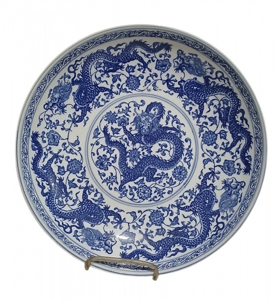 • Bowl em porcelana chinesa azul e branco, decorado com dragões e flores. Borda lisa.           Med. A. 06 x D. 30.5 cm.