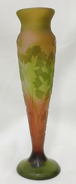 • ÉMILE GALLÉ (FRANÇA, Circa 1900). - Belíssimo vaso em pasta de vidro francês nas cores verde, marrom e ocre, decorado com orquídeas e folhagens em relevo. Vaso assinada "Gallé" no bojo. Medidas: 23 x 06.8 cm.
