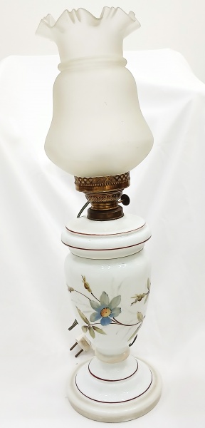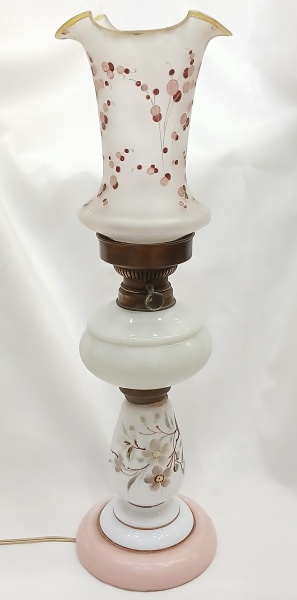 • Lampião eletrificado em opalina decorado por pintura floral esmaltada. Medidas: Alt. total  55 x 16 cm.