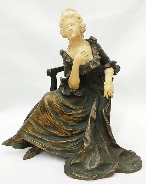 • Escultura em bronze e marfim francesa, representando "Donzela sobre Poltrona" numerado na base. 7633 de meados do século XIX  Medidas: Alt.  20 x 19 cm. (Uma das mãos, faltam 2 dedos)