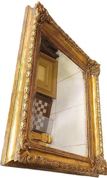• Antigo espelho bizotado com moldura em madeira trabalhada e patinada em ouro velho. Medidas: Alt. 88 x 103 x 11 cm