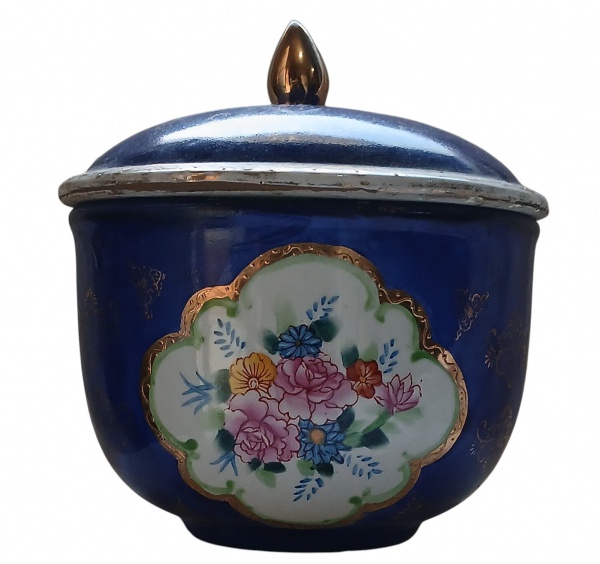 • Bowl esmaltado em porcelana francesa no tom azul royal estilo Sevres, reservas central esmaltada com flores policromadas. Medidas: Alt.  16 x 15 cm. Europa, circa 1930.