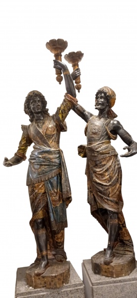• Par de belíssimo e grande "BLACK MOOR" em madeira esculpida, policromada e dourada. Veneza Séc. XIX  Medidas:  Alt. 155 x 50 x 35 cm