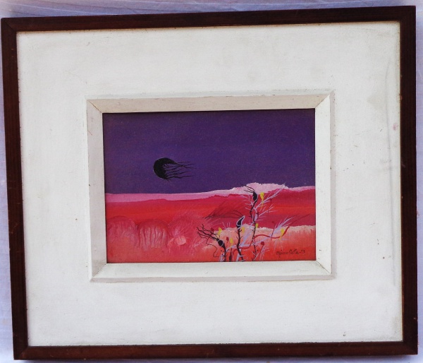 • Marcio Costa  "No espaço meu mundo" - Pintura óleo sobre tela tit. , dat. 73 e ass. no verso.  Medidas:  16 x 22 cm. com mold. 33 39 cm.