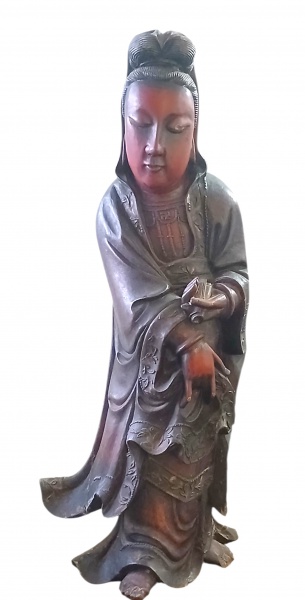 • Escultura em madeira laqueada Chinesa, representando Figura Guanyin  período  Ming.  Medidas: Alt. 88 x 38 x 20 cm  ( Escultura pertenceu acervo do pintor Chinês;  "LIN FENGMIAN" - Assim como mostra na foto da Família)