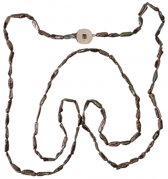 • Grande colar em pérola água doce barroca longo em forma irregular, com fecho em prata 925 com descrições caligrafia chinesa. Medidas: Compr. 1.54 cm.