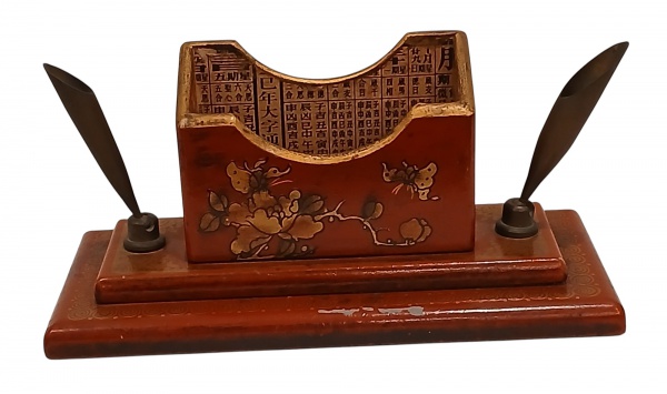 • Caixa de charão chinesa na cor vermelha, para estúdio. (Porta caneta ) com decoração com pintura de flores e escritas. Medidas:  Alt 10 x 09 x 20 cm.