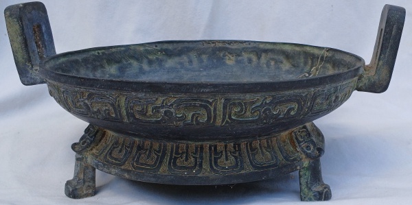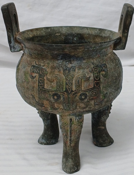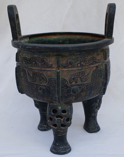 • Antigo Incensório Chinês em bronze patinado,  pés tripo ides. Com resíduos de argilas no interior que possibilitam testes de carbono e químicos para a época.  (Um dos pés, apresenta um quebrado)  Medidas;  Alt.18 x 13 cm.