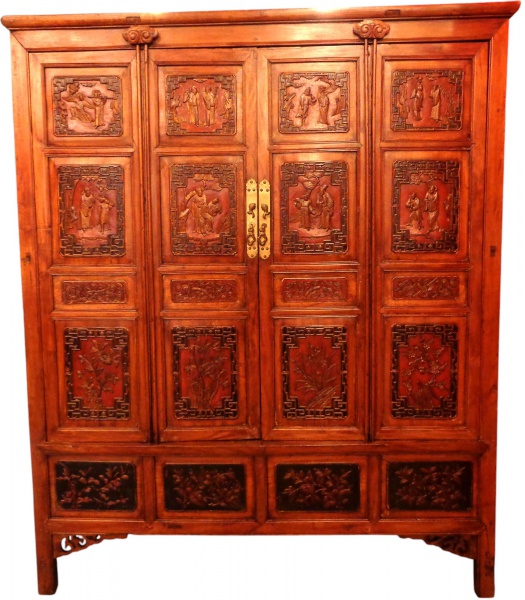 • Belíssimo Armário em madeira nobre chinês, apresentando quatro portas frontal com entalhes em alto relevos em reservas representando personagens. Interior apresenta 04  Gavetas, 03  Prateleiras e um avental de caixa para armazenamento oculto.  Séc. XIX.                                                                                                              Medidas:  Alt. 184 cm.  x  Larg. 153 cm.                                                                                                      (Um dos pés precisa de restauro)