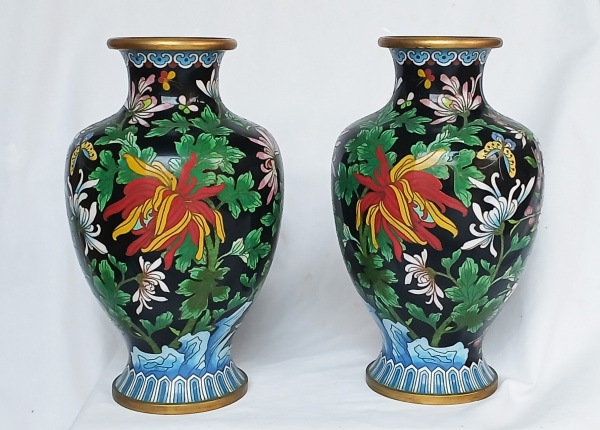 • Vasos em bronze dourado chinês, ornamentado em policromia de esmaltes "Cloisonné"  decorado com flores. Séc. XIX  Medidas: Alt.  31 x 15 cm.