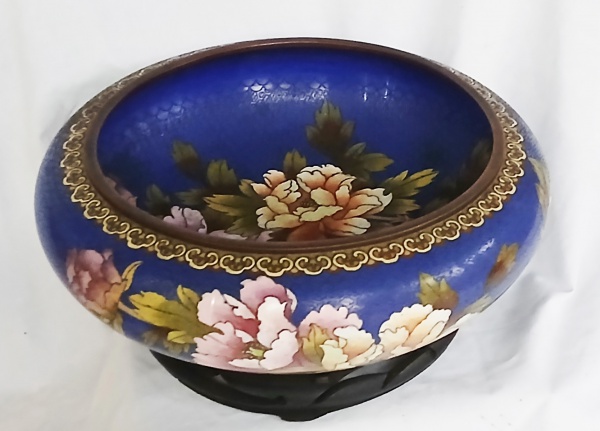• Lindo centro de mesa em bronze dourado chinês, ornamentado em policromia de esmaltes "Cloisonné" decorado por pássaro e flores. Séc. XIX  Com a base em madeira entalhada. Medidas totais: Alt. 14 x 31 cm  só o bowl Alt. 11 x 31 cm
