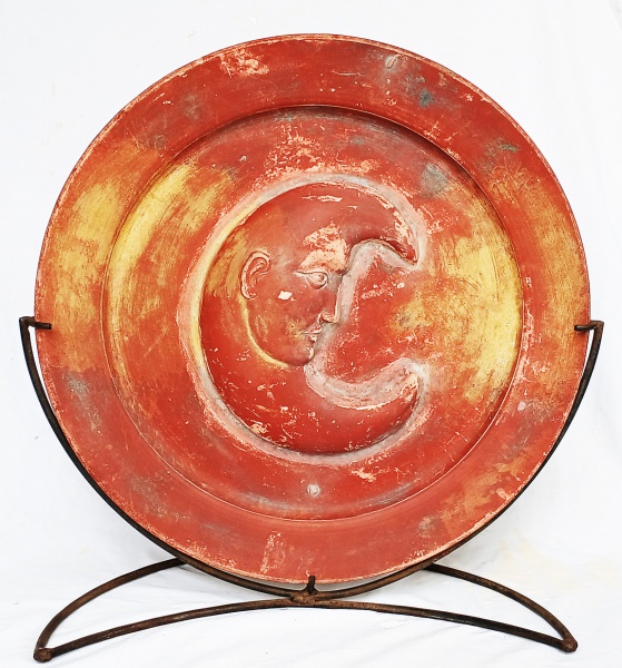 • Lindo medalhão em cerâmica, apresenta no centro meia lua em alto relevo em forma de rosto de perfil, assinado no verso. Assinatura não identificada. Medidas totais: Alt. 43.5 x D. 40.5 cm  só medalhão Alt. 03.5 x d. 40.5 cm