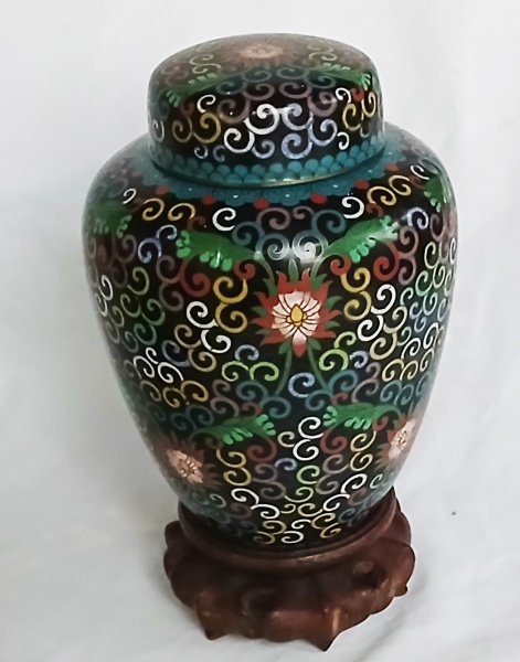 • Belíssimo vaso em bronze dourado chinês, coberto por esmaltes "Cloisonné" ornamentado por flores, com base entalhas em madeira. Medidas totais: Alt. 22 x 13 cm só vaso Alt. 19 x 13 cm