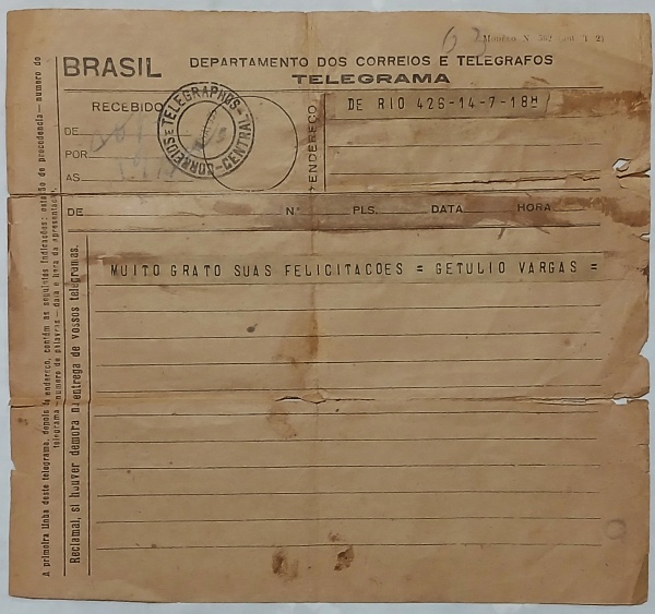 • Antigo telegrama dos correios e telégrafos do Brasil. Carimbado e datado, maio 1935(MUITO GRATO SUAS FELICITAÇÕES = GETÚLIO VARGAS)