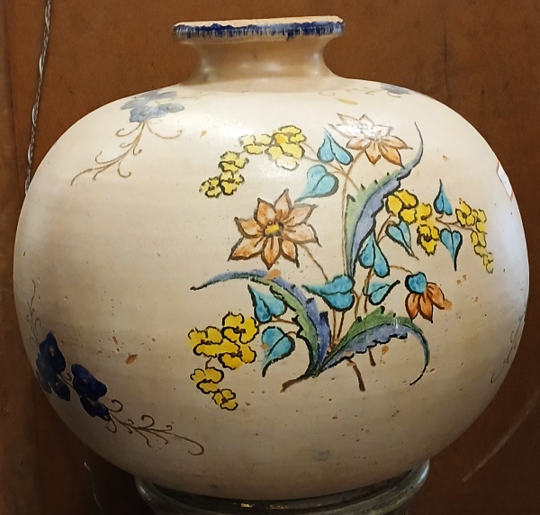 • Antigo vaso em cerâmica Itaipava anos 50/60 em formato globular com uma abertura de gargalo curto a decoração apresenta motivos florais em esmaltes azuis, amarelos e laranjas feito a mão. Medidas: Alt. 33 x 38 cm