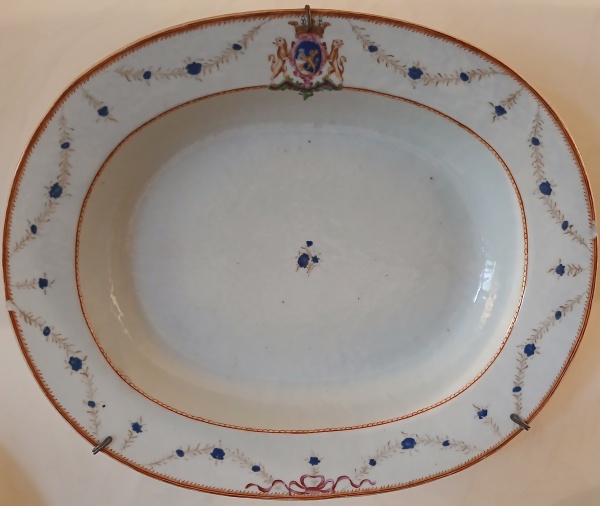• CIA DAS ÍNDIAS DINASTIA QING PERÍODO QIANLONG (1736 - 1795) Travessa em porcelana da Cia das índias, esmaltada decorada com guirlandas na borda e com Brasão  à Identificar. Medidas:  38.3 x 31.5 x 05 cm.  (Assim conforme nas fotos, cada lado um bicado)